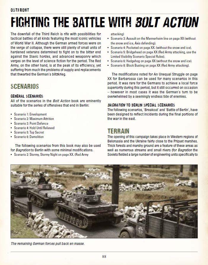 Take charge of Operation Barbarossa and drive towards Moscow or command the steadfast defenders of the Soviet Union. From the early battles for Leningrad and Sevastopol to the tank clash of Kursk and the bitter urban warfare of Stalingrad, this new Theatre Book for Bolt Action provides wargamers with new scenarios and special rules that give them everything they need to focus their gaming on the Eastern Front.