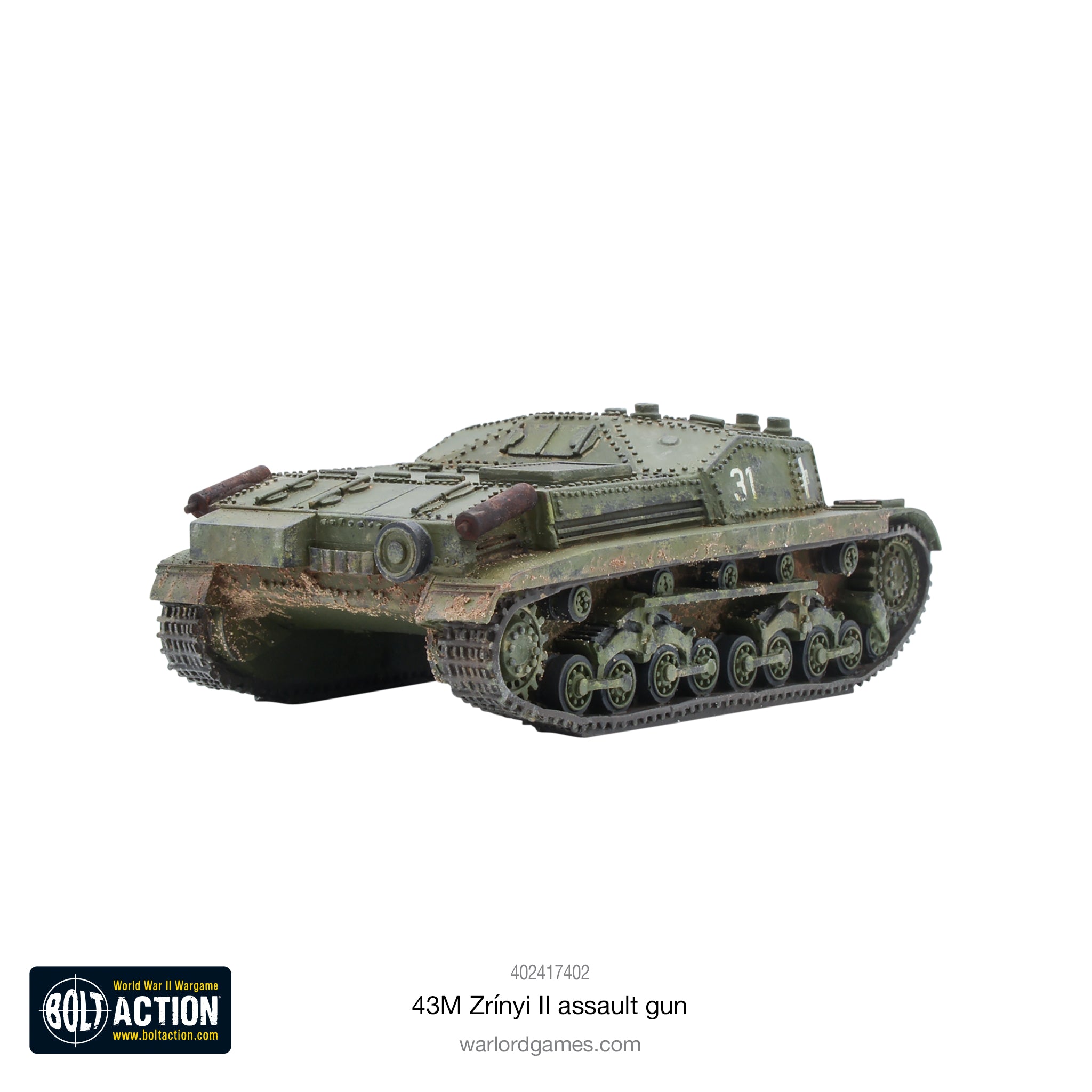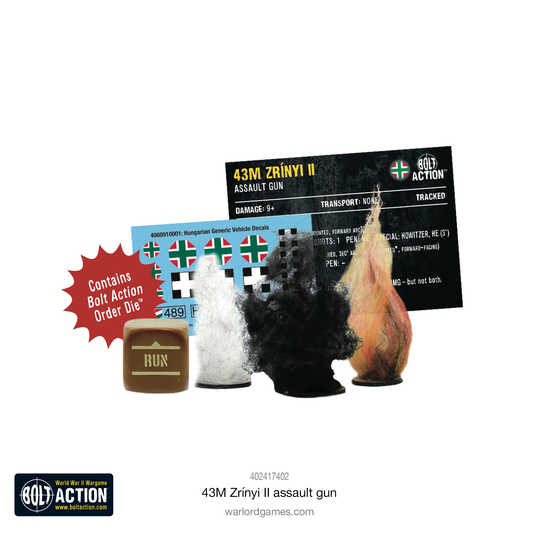 Box contains one 43M Zrínyi II Assault Gun, cast in resin & metal, with waterslide decal sheet, Bolt Action Order Die, Bolt Action: Third Edition vehicle stat card, and vehicle damage markers.