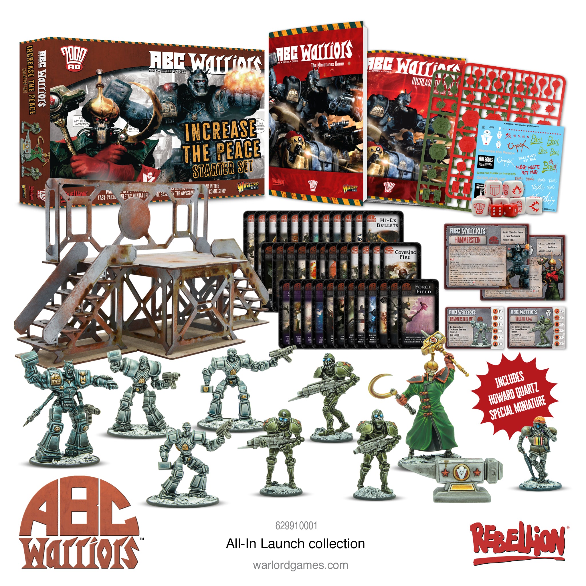 This launch collection arms you with one of each of the initial releases for the game. The Increase the Peace starter set contains scenery, tokens, Tarot cards, character & auxiliary cards and all the rules you need to play, including rules for combat missions, an immersive campaign system and profile lists to create your forces as you take control of the ABC Warriors or their Volgan counterparts. Most importantly it kicks off the collection high quality miniatures of impressive idiosyncratic (and big and smashy!) robots for which you to do tabletop battle – Sergeant Hammerstein and his Hammerstein Mk Is representing the ABC Warriors, and Volkhan and his Volgan Ak47s opposing them.