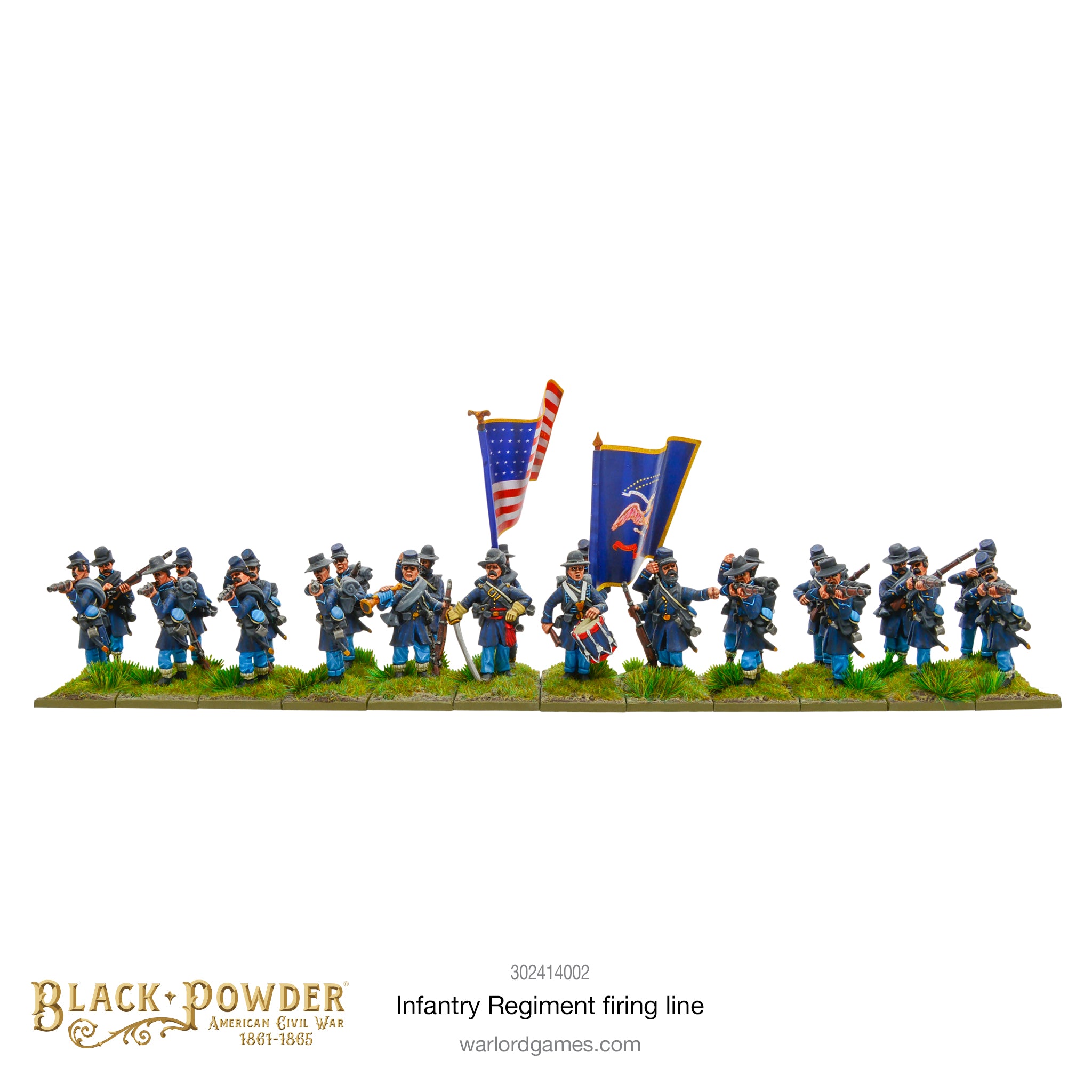 Box contains 24 Warlord resin figures (including command group), plastic bases, MDF Snake Fence scenery, cap badge decal sheet and full-colour flag sheets for both Union and Confederate troops.