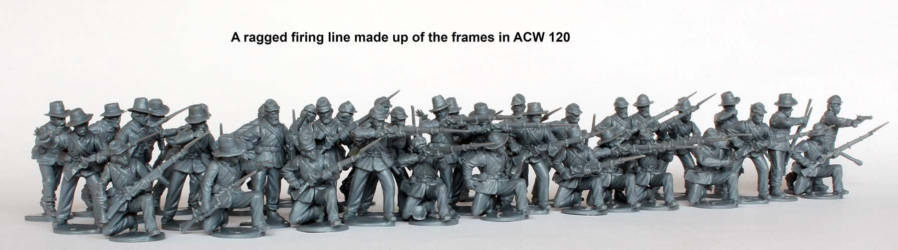 The figures in this box are in skirmishing poses; firing, loading and running. They are all in sack coats and have the choice of either forage caps or broad-brimmed hats. The figures are the same as the Union box ACW 115 but are a different mix to allow a skirmish force to be built. You could also create a ragged firing line with most of the the figures too.