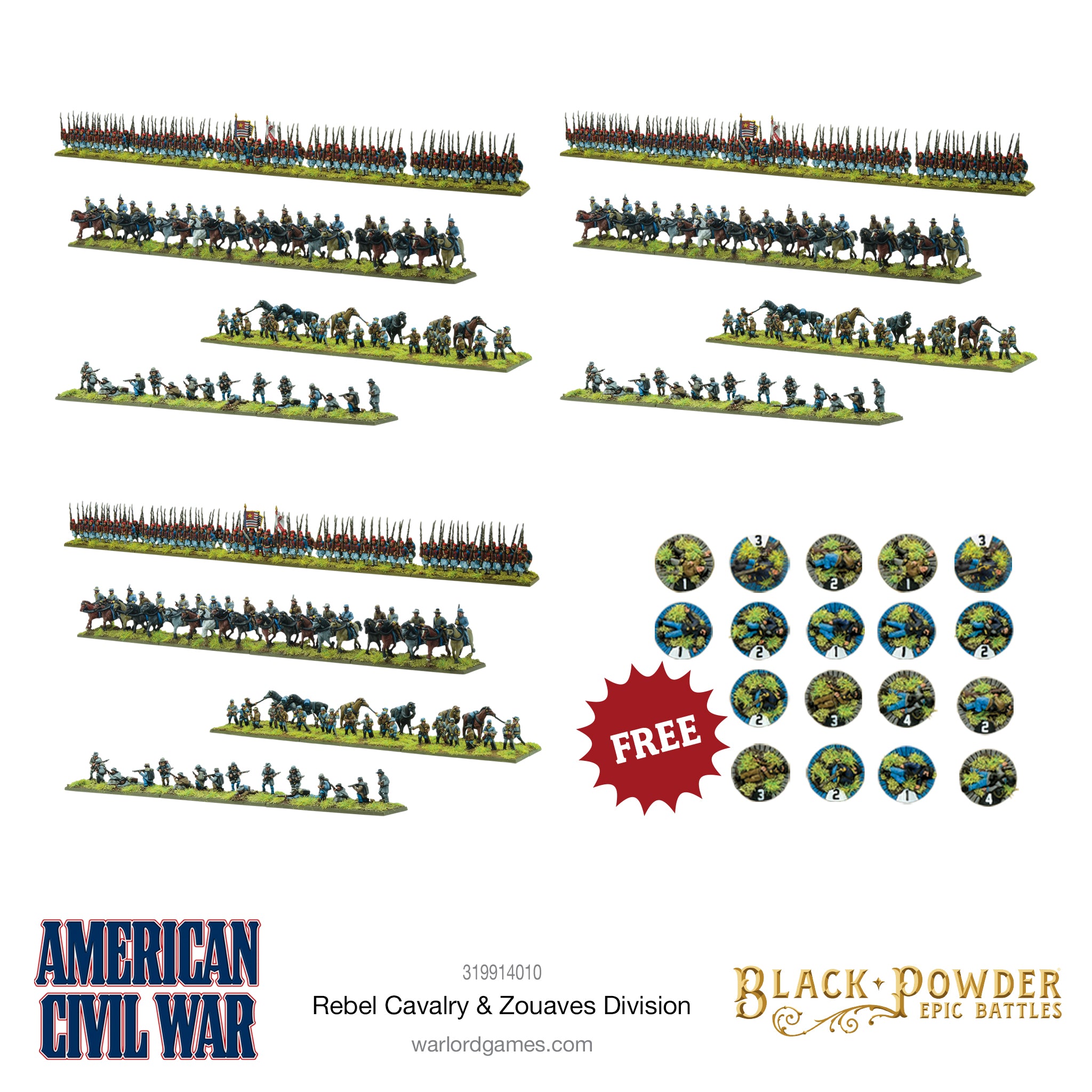 This bundle provides enough models to field a complete Confederate division comprising three zouaves regiments of 100 men each, three regiments of cavalry, three regiments of dismounted cavalry and three regiments of skirmishers. As an added bonus, you’ll get some Warlord ResinTM casualty markers completely free; vital to track proceedings on the Black Powder Epic Battles tabletop.