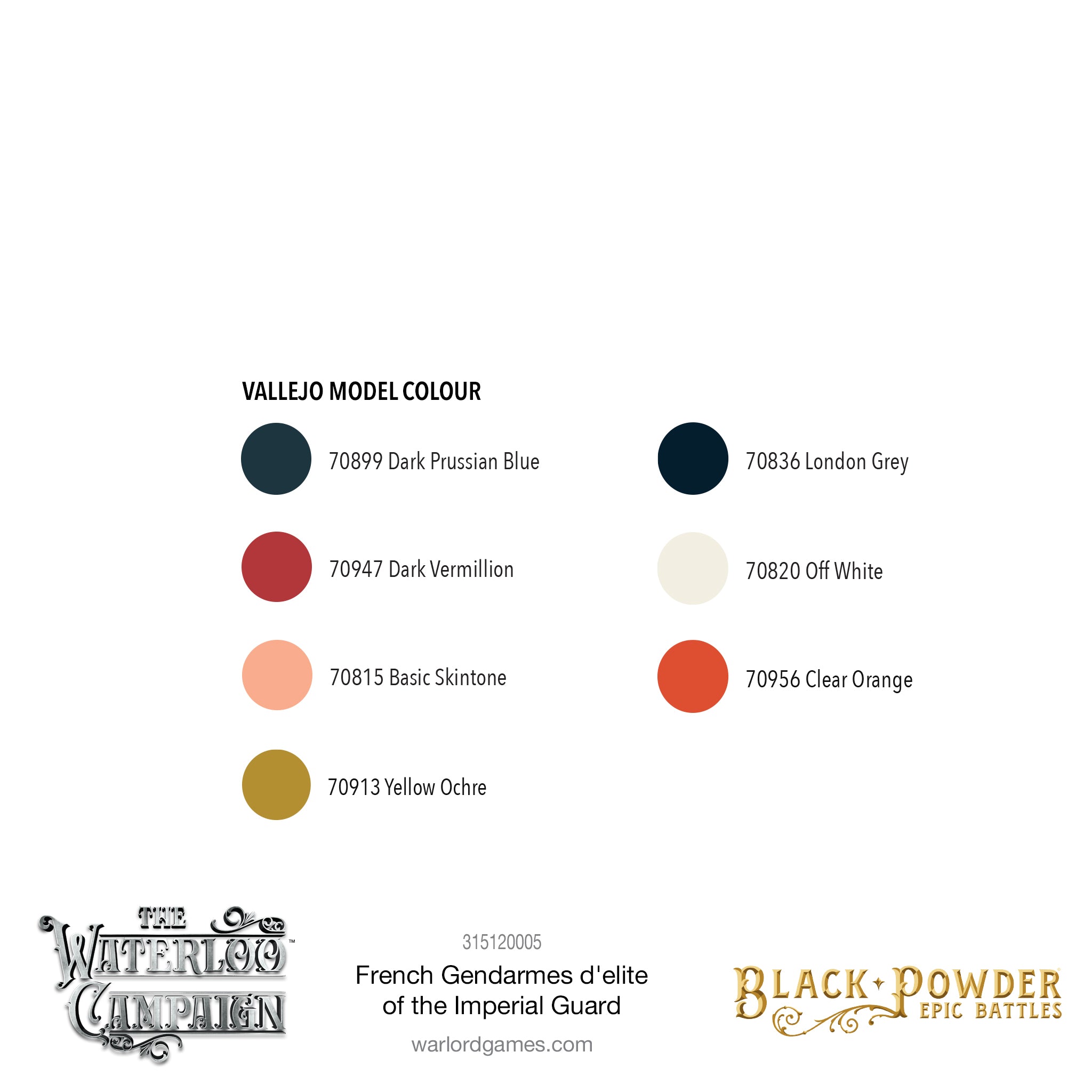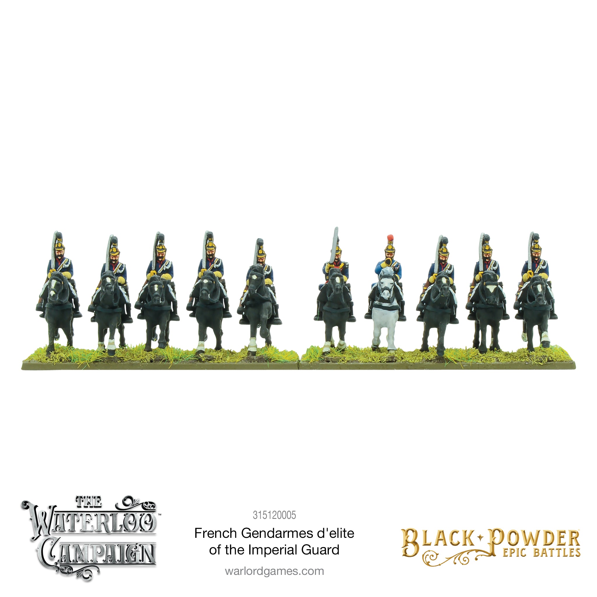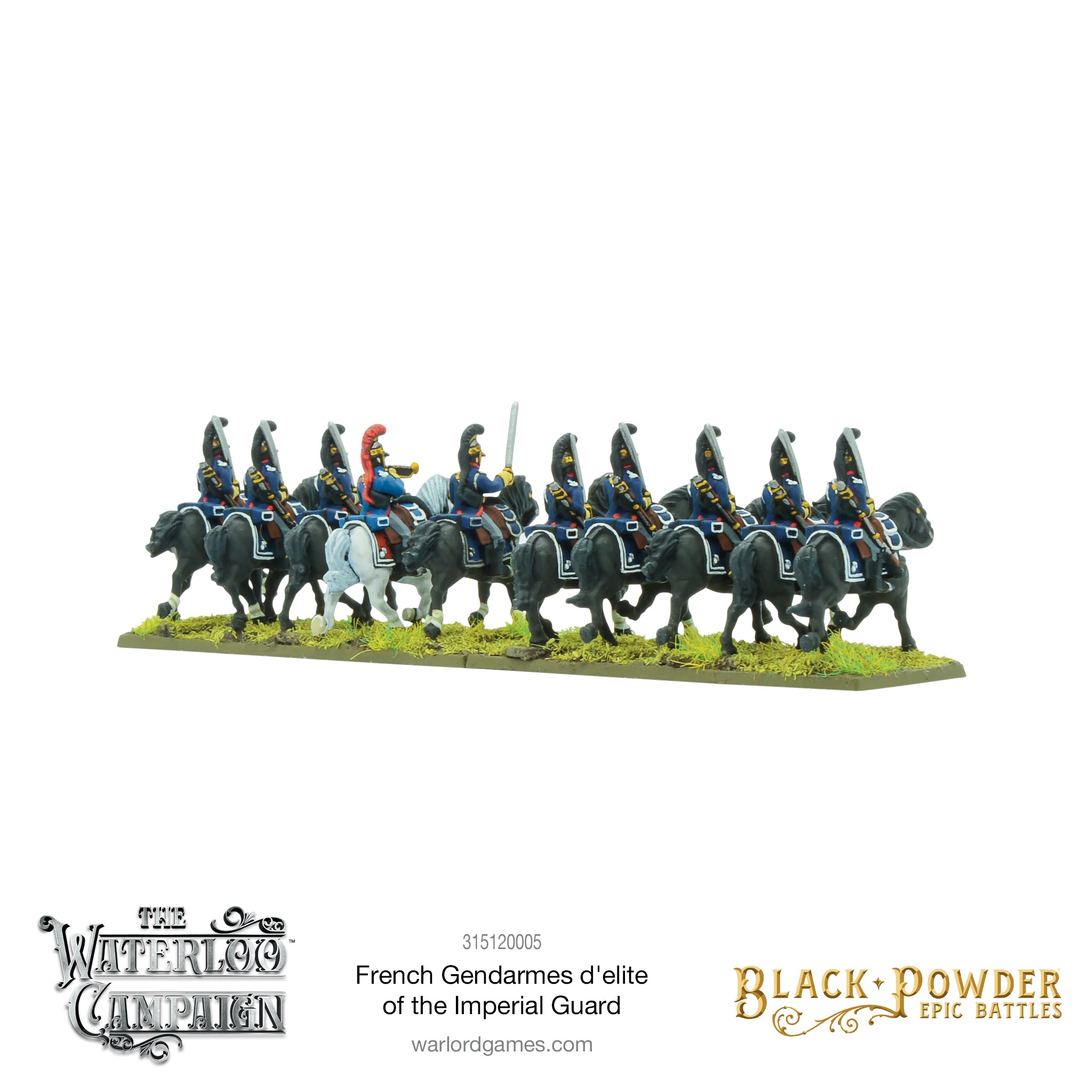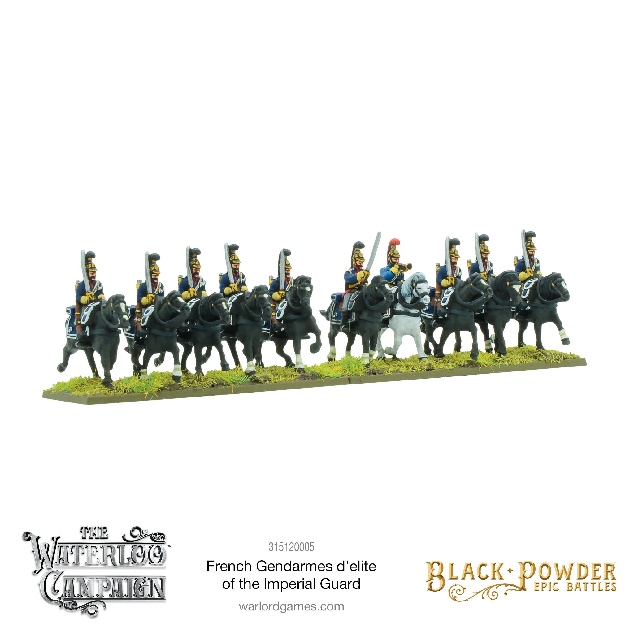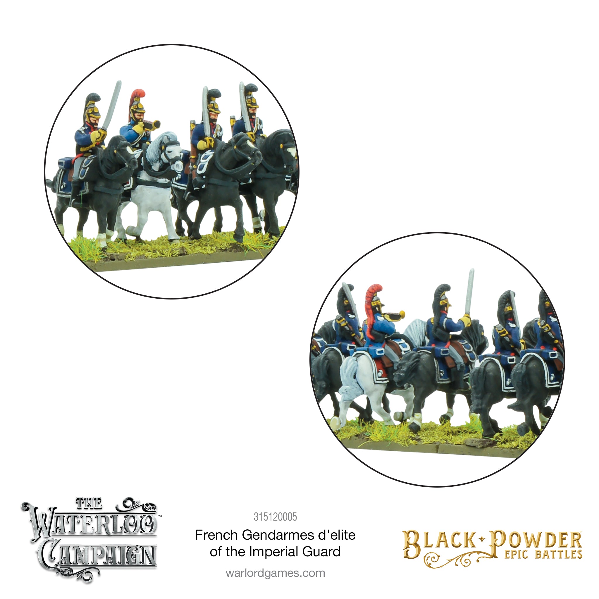 Riding large black horses, these highly disciplined, somewhat ruthless men were greatly feared by draft-dodgers or other ne-er-do-wells. More often than not the Gendarmes d'elite served as small units compared to other regiments of Imperial Guard cavalry.