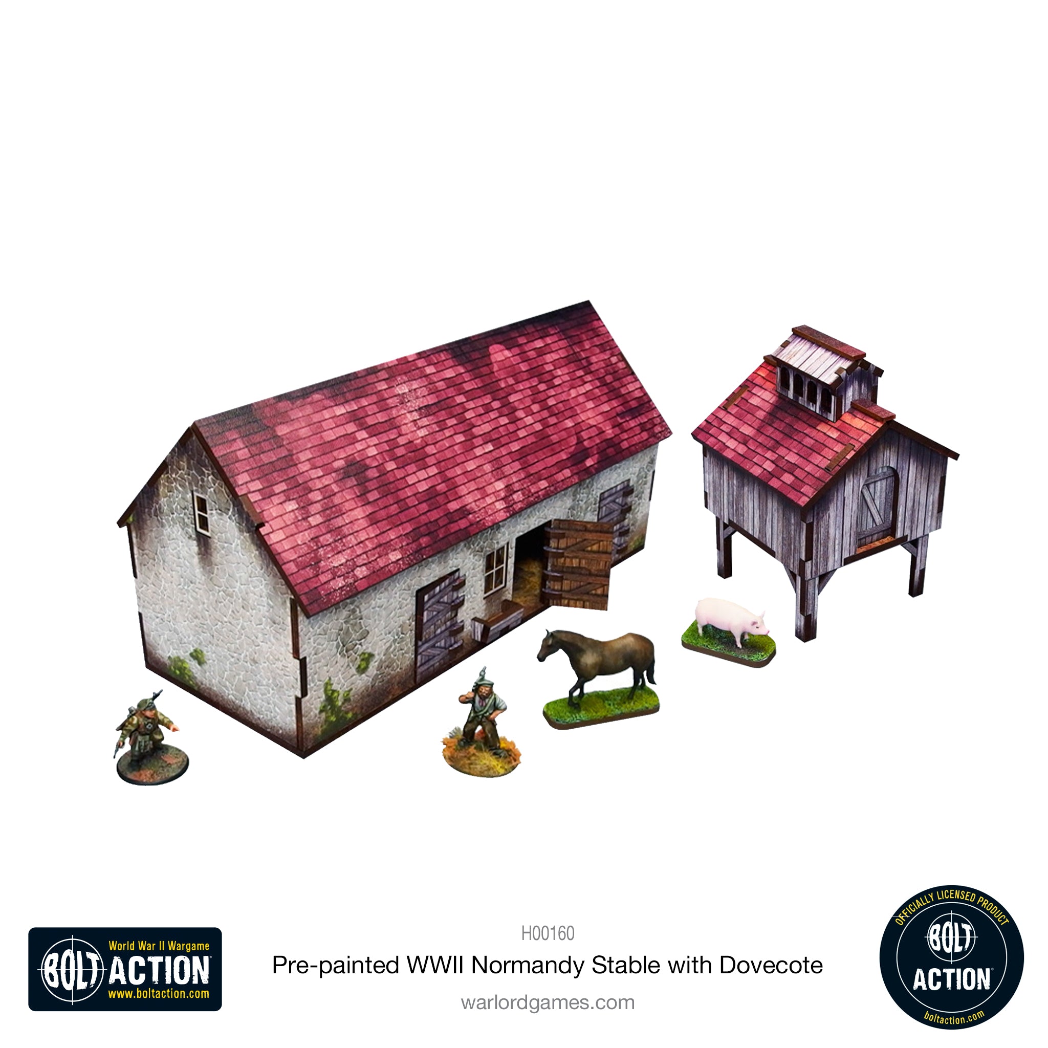 A set of 2 multicolour pre-painted (UV-printed) WW2 Normandy Stable w. Dovecote buildings with accessible colourful interior, removable roof and ruined ground floor of the main building. Room to fit in a whole infantry squad inside. Pre-cut acrylic transparent windowpanes included. Option to assemble with open or closed doors.