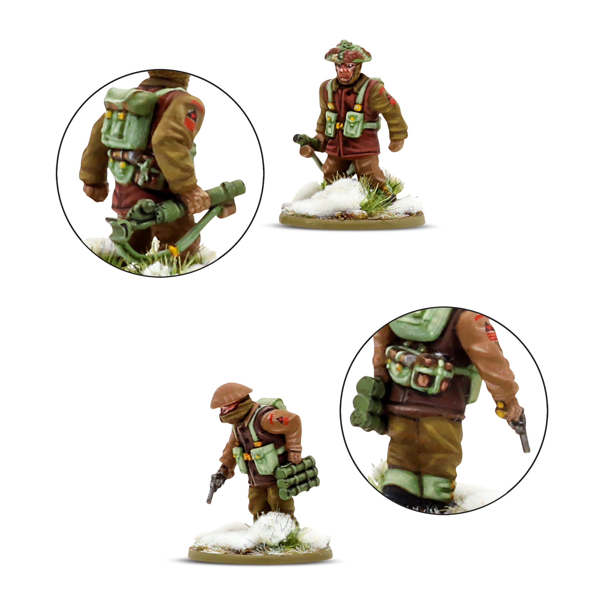 This box contains 30 infantry models in winter clothing, including greatcoats and leather jerkins, along with a huge variety of weapons and equipment, allowing you to build a wide range of British or Canadian units themed around the latter period of WWII in Europe. Included on each sprue are Lee-Enfield rifles, Sten submachine guns, Bren light machine guns, a PIAT anti-tank launcher, light mortar, flamethrower, and even minesweeping equipment - to name but some of the contents! The box also includes a range of head options, including the famous ‘tin hat’ helmets, cold-weather balaclavas, General Service caps, and bonnets for Scottish units, as well as a plethora of options allowing you to make officer teams and other specialist units.