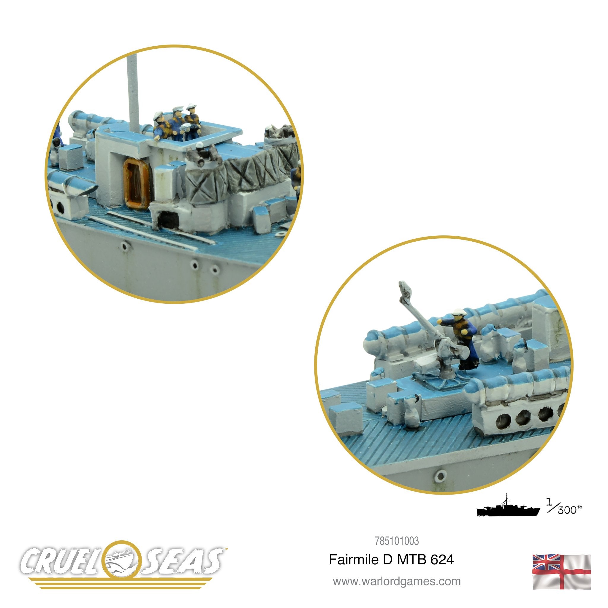This model represents motor torpedo boat 624 in its final configuration, including an automatic 6pdr on the foredeck, the standard two HMG tubs on either side of the bridge, a Holman projector amidships and a twin-20mm cannon on the stern.