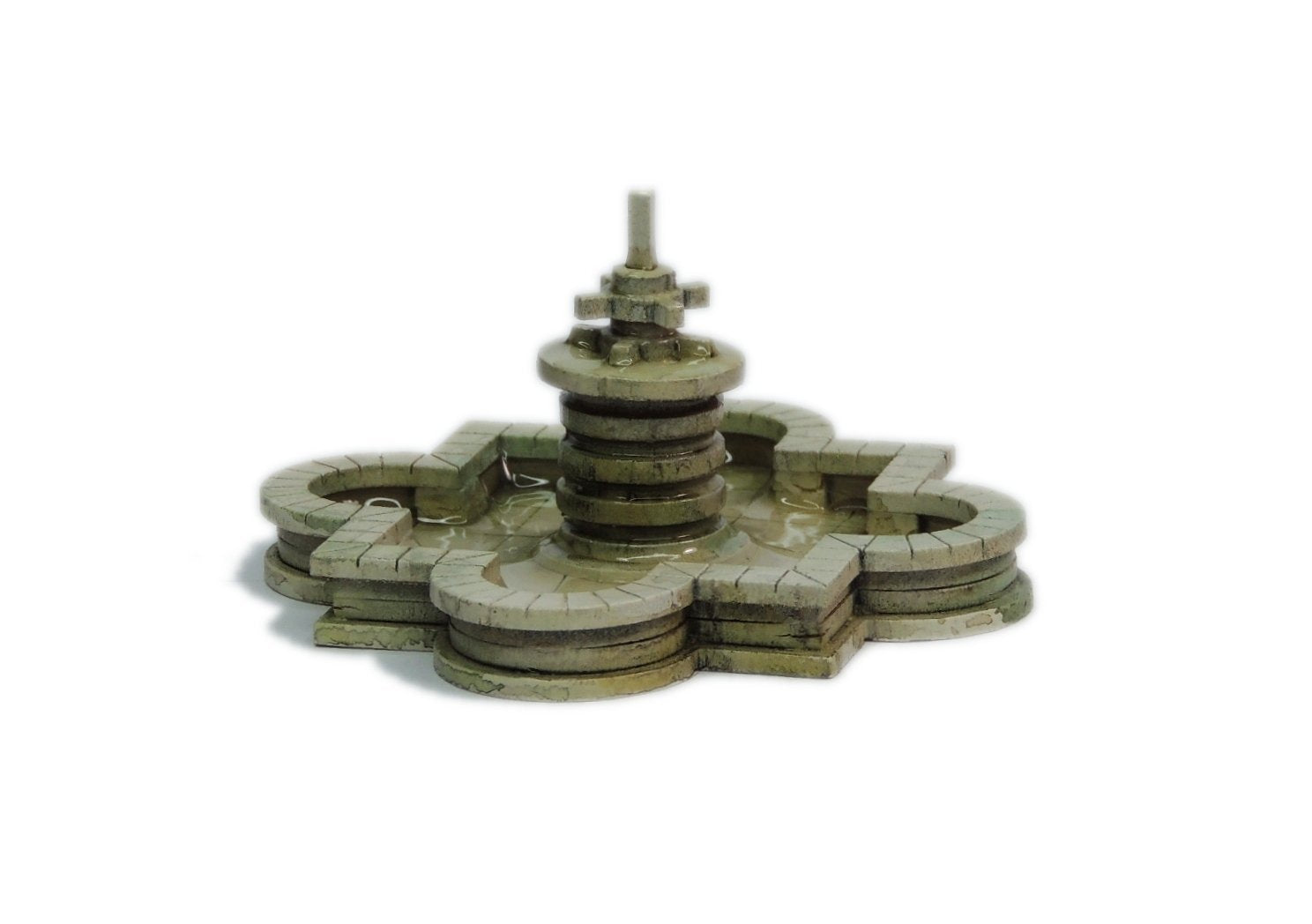 The terrain is made from MDF, is part of the Sarissa Precisions Streets of Rome range and requires assembly. Large fountain footprint 100mm, small fountain 75mm