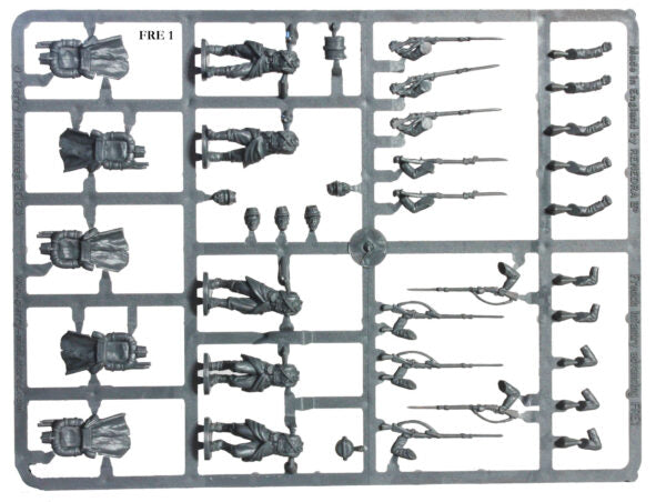 This box contains parts to assemble 25 figures advancing at high porte or all can be marching with shouldered rifles. There are also 10 figures that can be used as skirmishers, firing and loading, plus a command group. There are 38 figures in total and the box includes an information sheet, bases and flags.