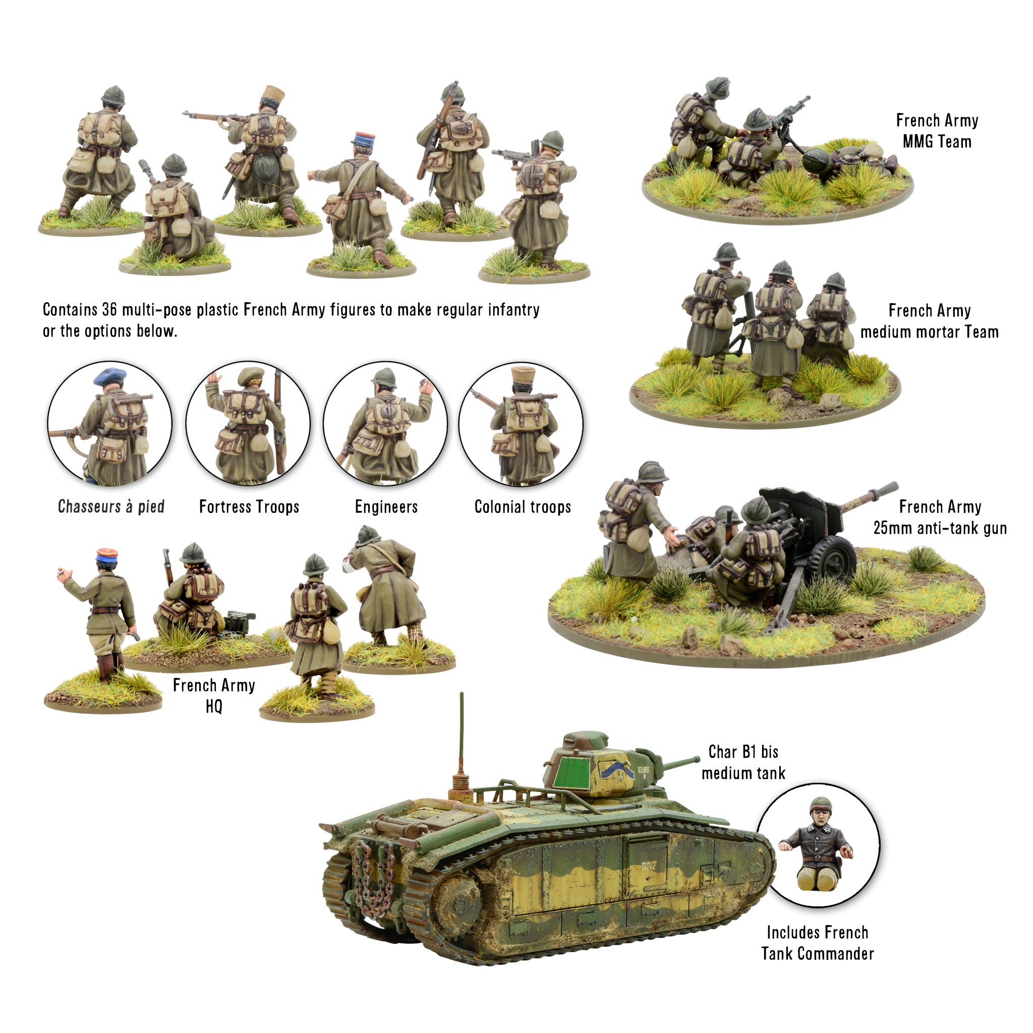 This Bolt Action starter army provides a solid core to your new French Army force. The highly detailed multi-pose plastic infantry can be assembled and painted as regular infantry, fortress troops, chasseurs a pied, engineers or colonial troops (Algerian, Moroccan & Tunisian), giving you a colourful army with plenty of variety and flexibility with which to face the German Blitzkrieg.