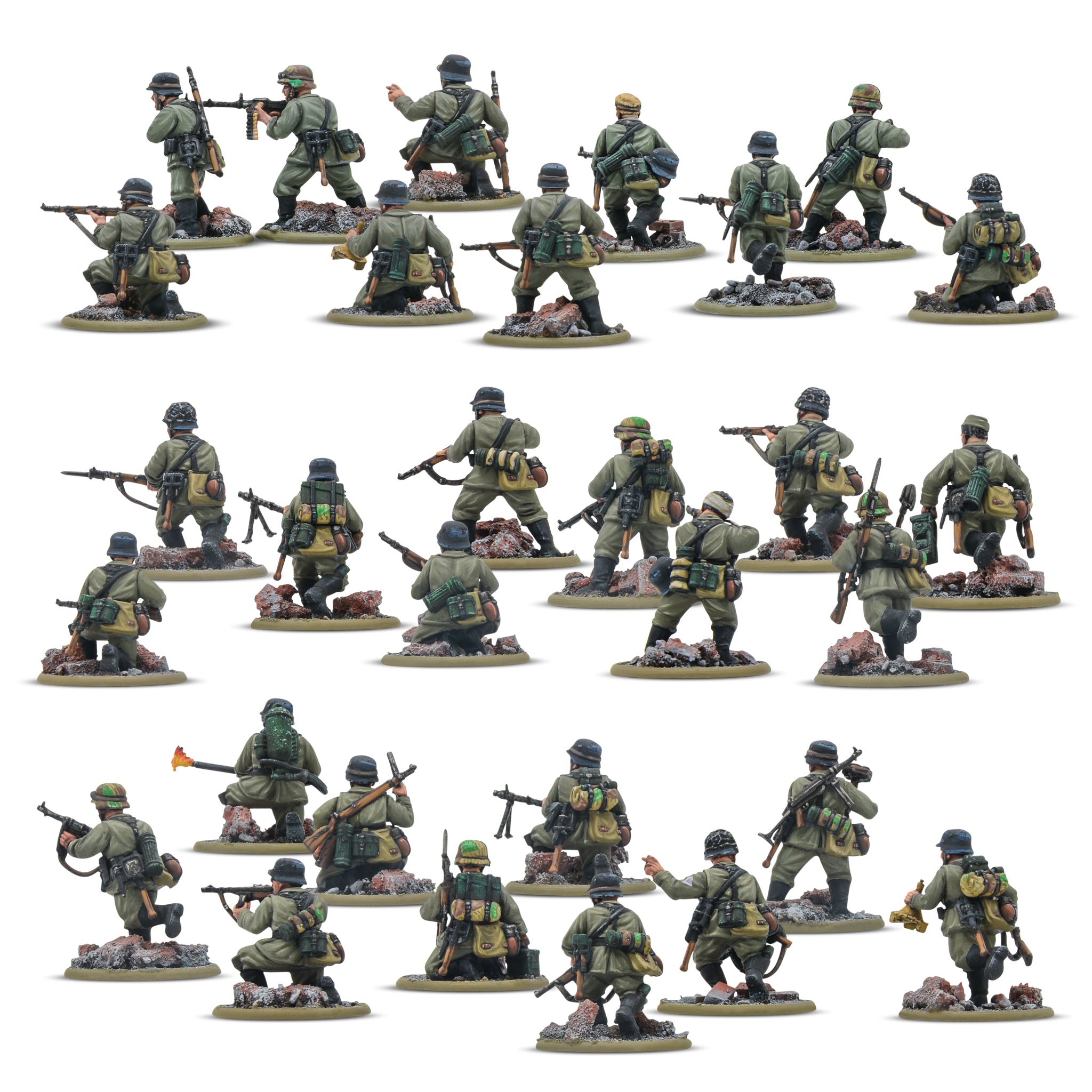 This box contains 30 infantry models with a wide range of weapons and equipment, suitable for building a wide variety of troop types from every period and theatre of World War Two in which the Germans participated. Each frame includes Kar 98 rifles, MP40 and captured Russian submachine guns, a Luger and flare pistol, two MG34 light machine guns with ammunition boxes, a GrB-39 grenade launcher, an anti-tank rifle & a flamethrower! Plenty of headgear options, such as helmeted, bareheaded and field officer's caps, are included, and there are plenty of accessories for specialist troop types and commanders. You also get three 60mm round bases, allowing to assemble medium machine gun and other weapons teams. Also Included are wall sections and bricks, perfect for adding characterful details to miniature bases and creating dioramas.