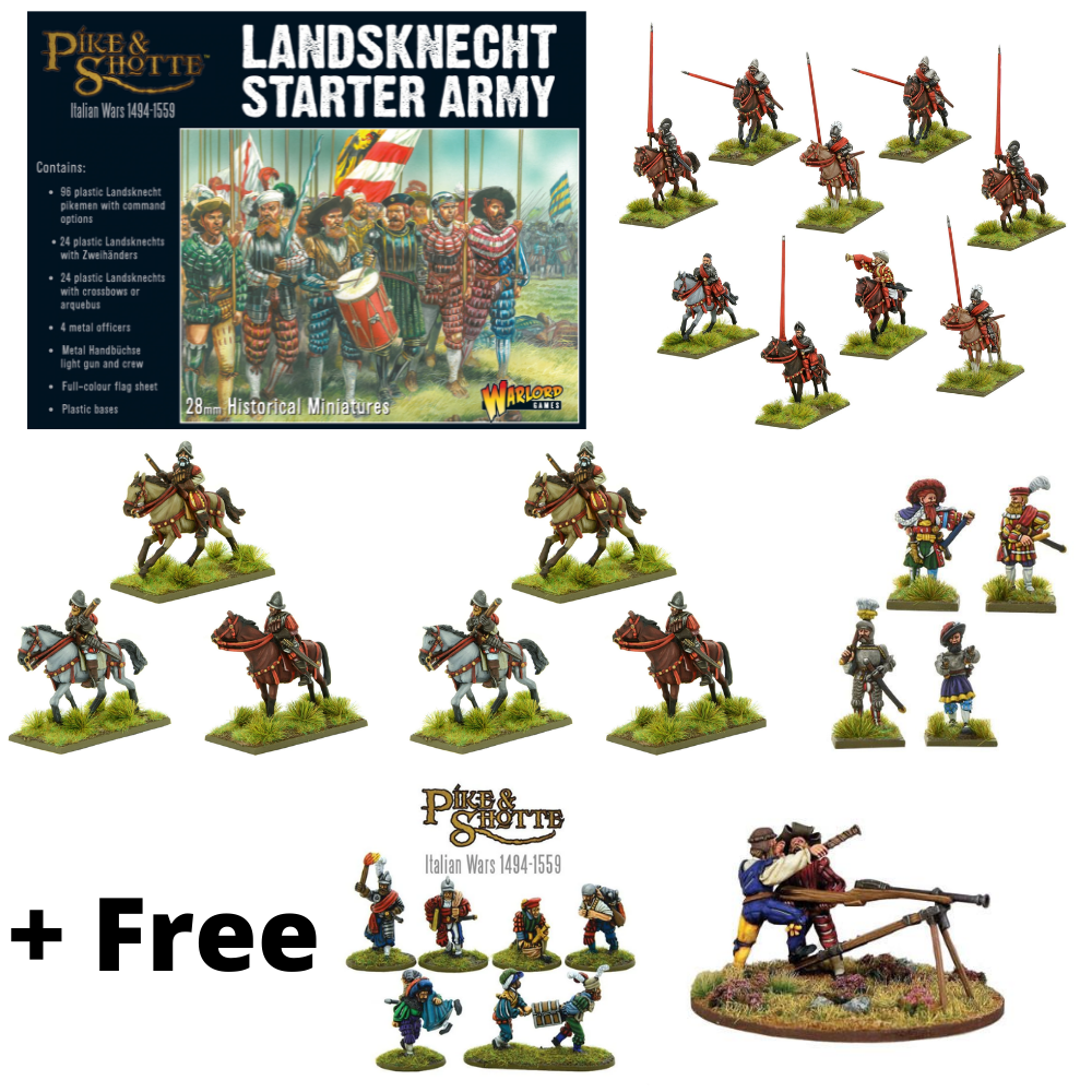 This bundle is designed to get you started with a Landsknecht Pike & Shotte army. Anchored by a solid core of pikeman ably supported by missile troops to achieve the tactical edge that came to dominate the period of the 15th – 16th Century Italian Wars. We’ve included mobility by way of mounted Arquebusiers and Gendarmes, as well as officers to lead your new army.