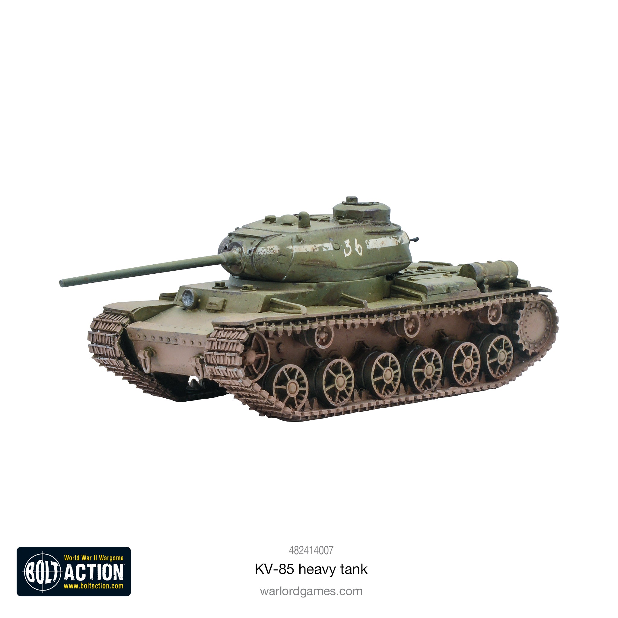 Box contains one resin and metal KV-85 heavy tank, Bolt Action Order Dice, waterslide decals, Bolt Action: Third Edition stat card, and Achtung Panzer! Tank Datacard and tokens.