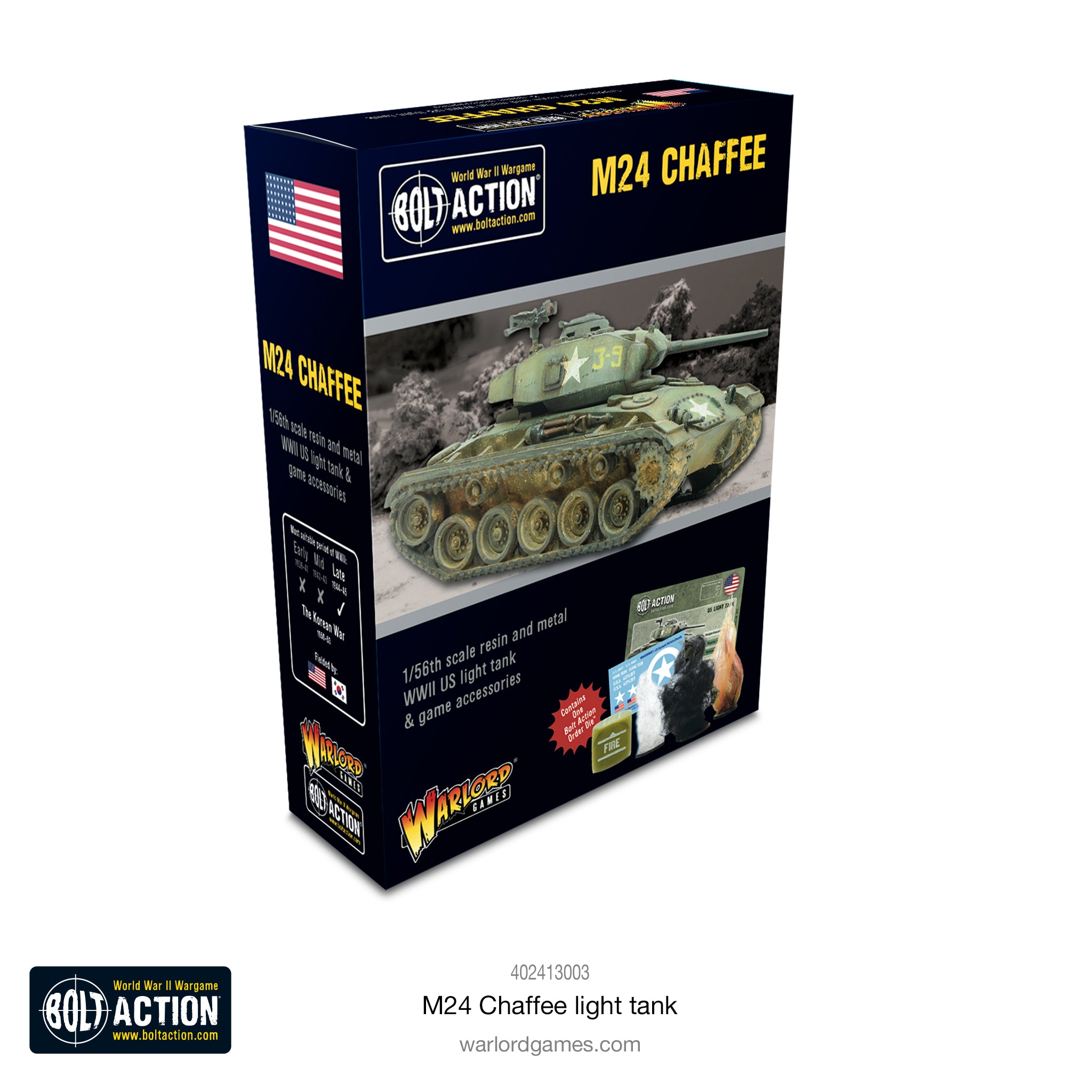 Box contains one resin and metal M24 Chaffee light tank, order dice, waterslide decals and game accessories.