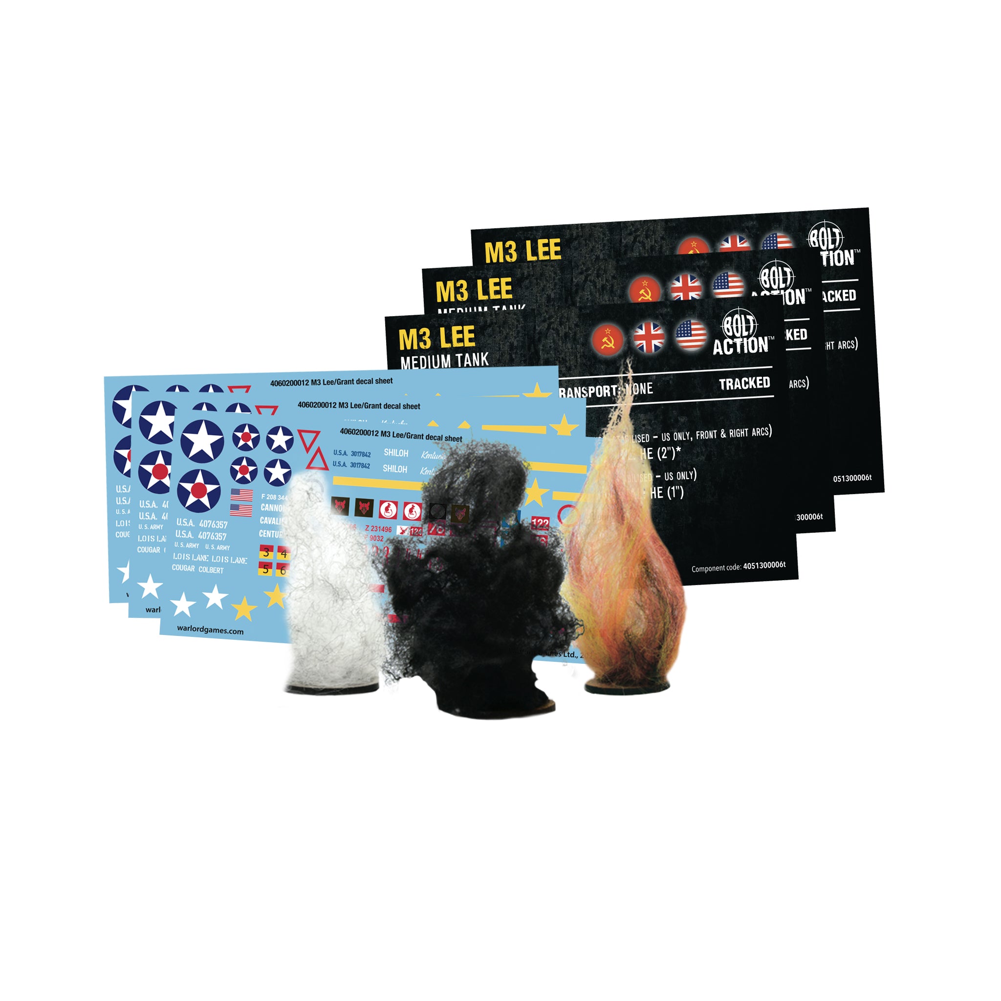 Includes three plastic M3 Lee medium tanks, Bolt Action stat card, assembly guide, three full-colour waterslide decal sheets for US and Canadian vehicles and vehicle damage markers
