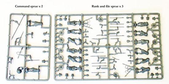 Heads and arms are separate, as are shields. There are options for rifleman as well as spears, sword and 'throw-stick' arms.