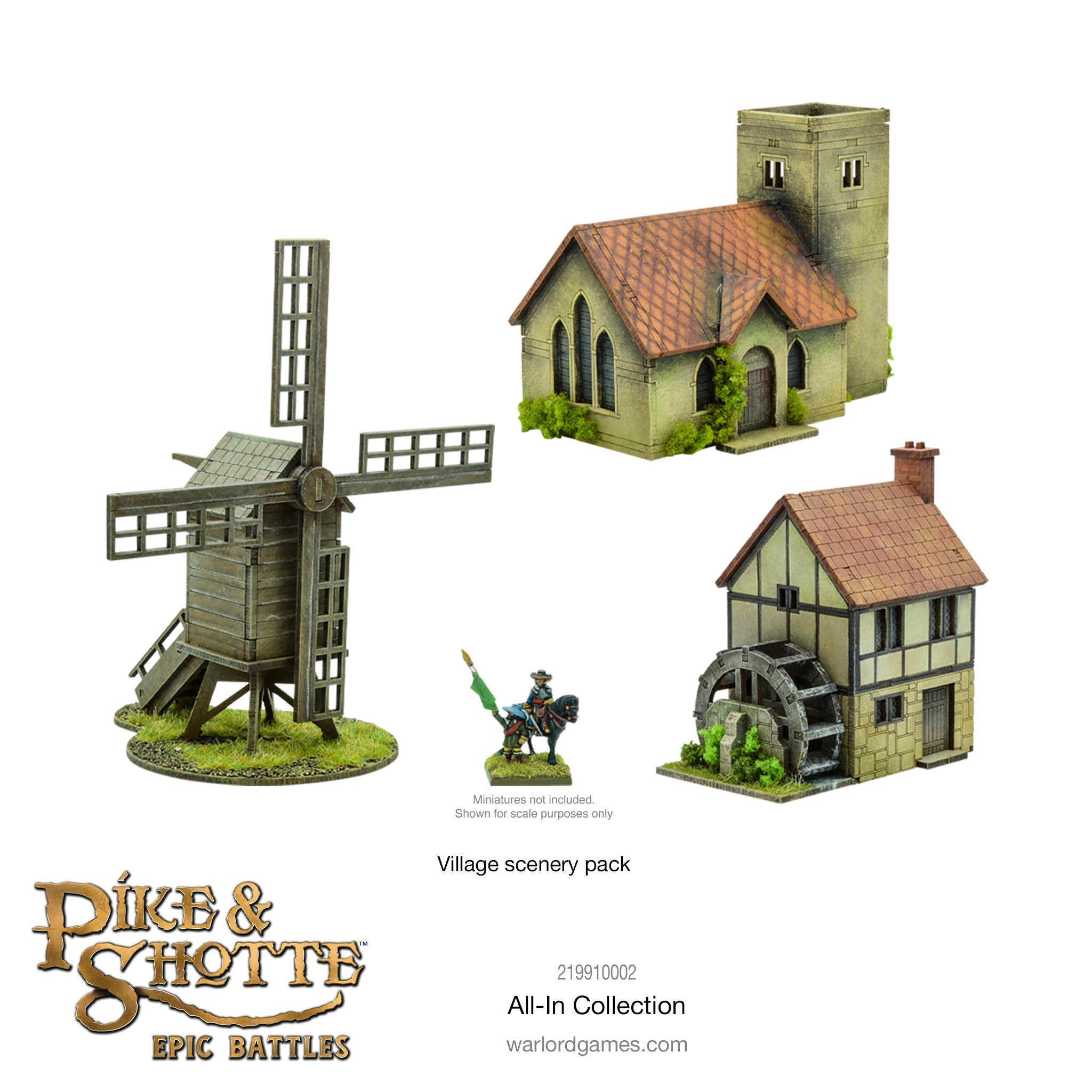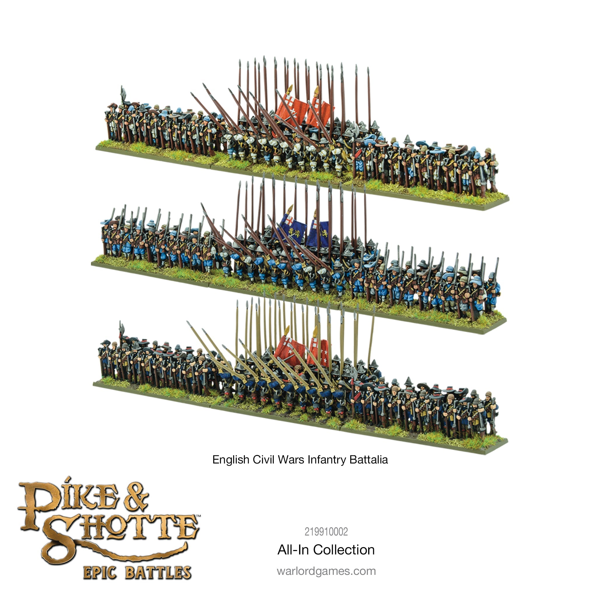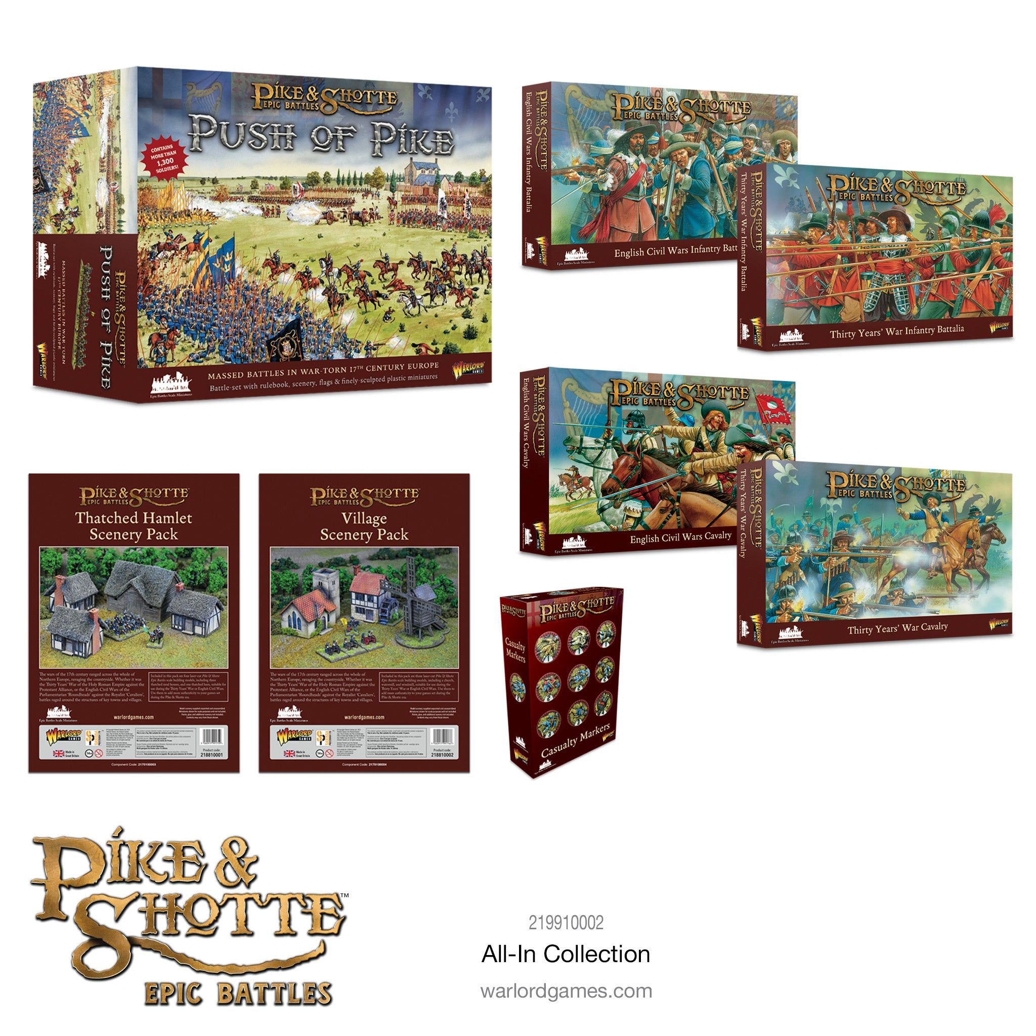 This All-In Collection gives you one of each of the initial releases for Pike & Shotte Epic Battles, at a fantastic saving, giving you a fine array of infantry, cavalry and artillery miniatures, all the tools you’ll need to replicate the battles of the English Civil wars and/or the Thirty Years’ Wars, as well as MDF scenery and casualty markers that will lend your tabletop an extra air of authenticity! You’ll even get three of the pre-order exclusive Gun Emplacements miniatures absolutely free.