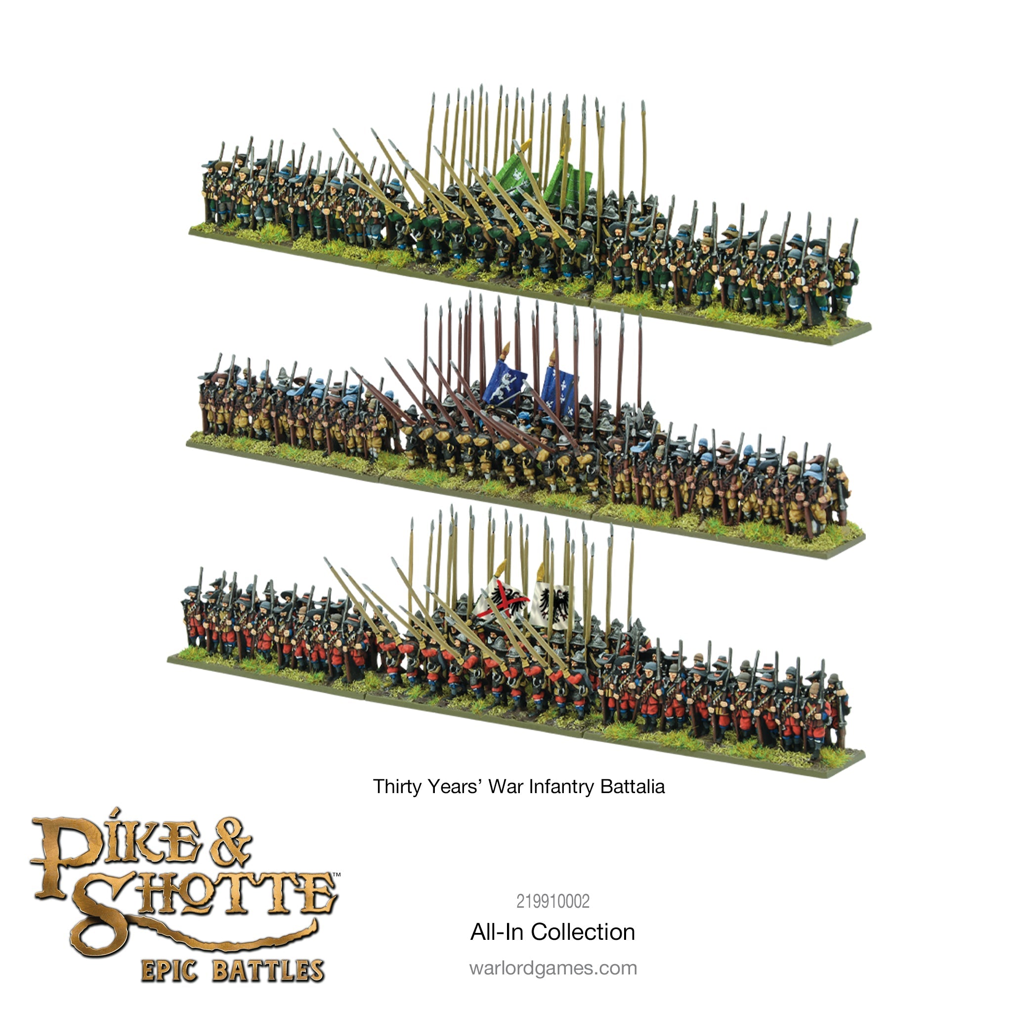 At the core of this collection is the Pike & Shotte Epic Battles: Push of Pike starter set, which provides you with all the information you need to refight the wars that raged across Europe in the seventeenth century on an epic scale, with period specific additions that capture the tactics, conditions, and prominent personalities of both these cataclysmic conflicts. Packed with 1,300 miniatures, the Push of Pike starter set also contains the brand-new Pike & Shotte Epic Battles rulebook.
