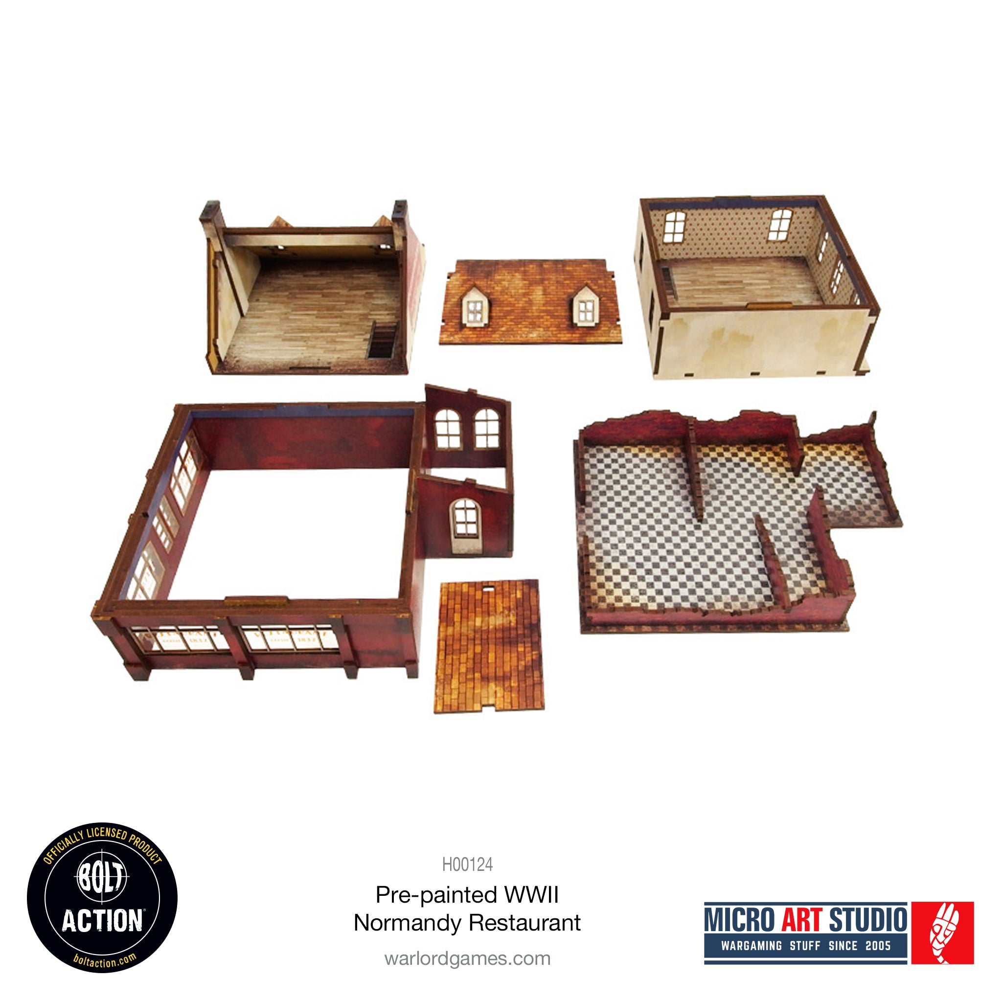 Multicolor prepainted (UV-printed) 3-level WW2 Normandy Restaurant building with accessible colorful interiors, removable levels and removable ruined ground floor. Room to fit in the whole infantry squad inside. Pre-cut acrylic transparent window panes included. Option to assemble with open or closed doors.