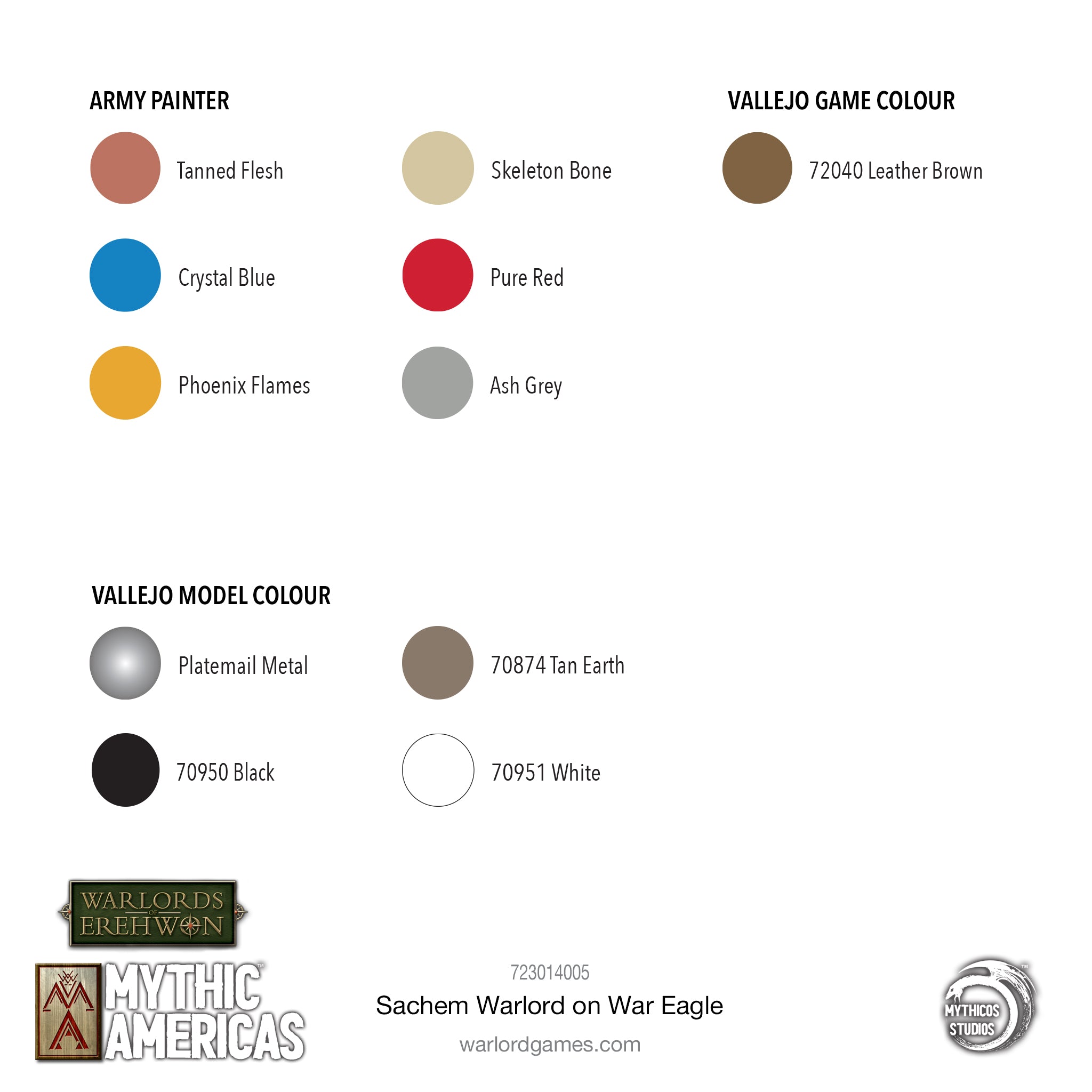 A Sachem Warlord always leads a Tribal Nations warband. Chosen by the people for their bravery, wisdom and ferocity these mightiest of Tribal Nation warriors lead their warband to victory. Gliding high above the battle on the back of a giant War Eagle they survey the battlefield before swooping down to make a lightning-fast attack.