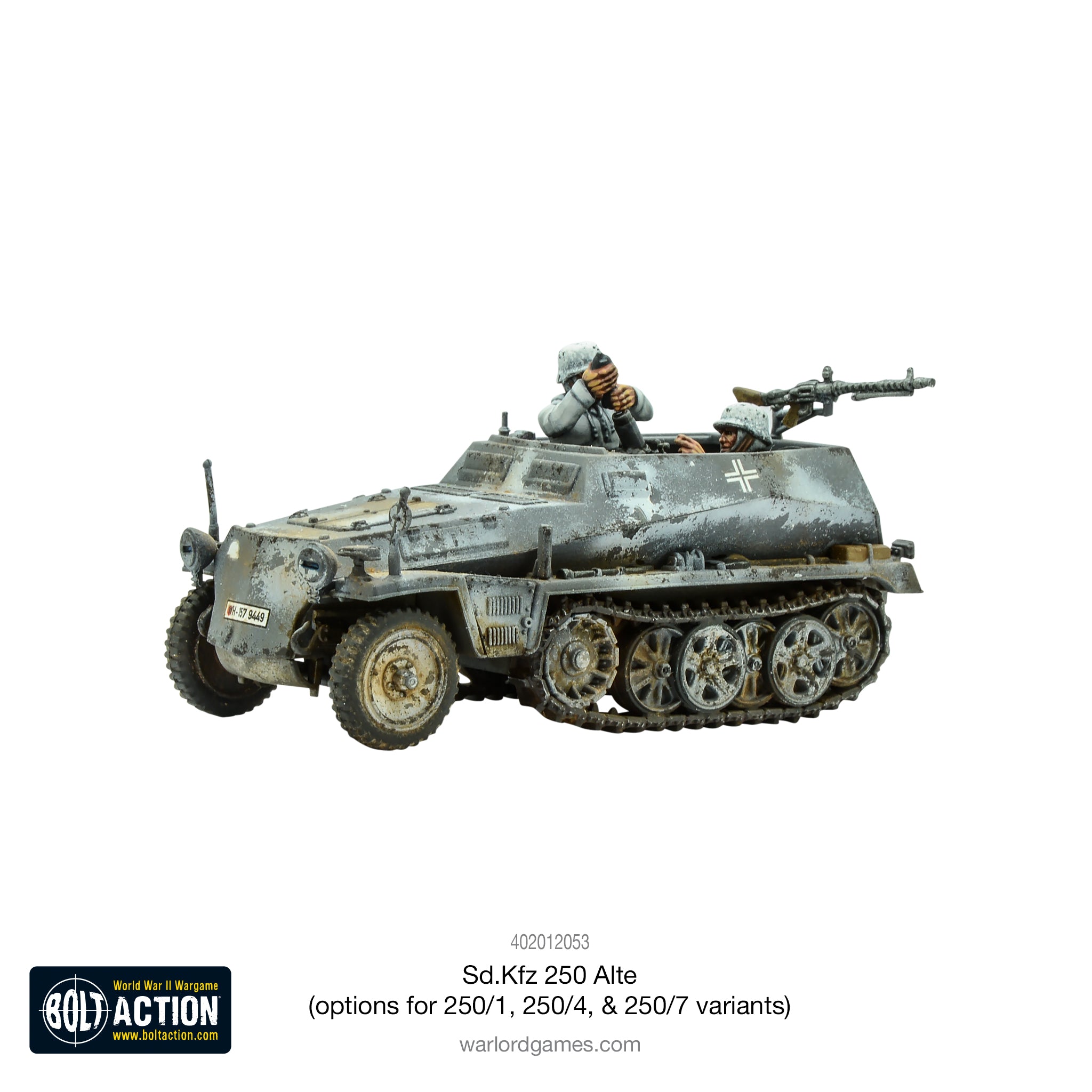 Includes one plastic Sd.Kfz 250 (Alte) half-track, Bolt Action stat cards, full-colour waterslide decal sheet, assembly & painting leaflet, and vehicle damage markers.