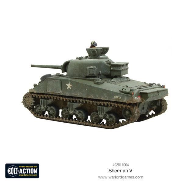 In games of Bolt Action the Sherman V is a medium tank armed with a medium anti-tank gun that benefits from the Improved HE special rule, a coaxial MMG, hull mounted MMG and optional pintle mounted HMG. It can be included in Armoured Platoons.