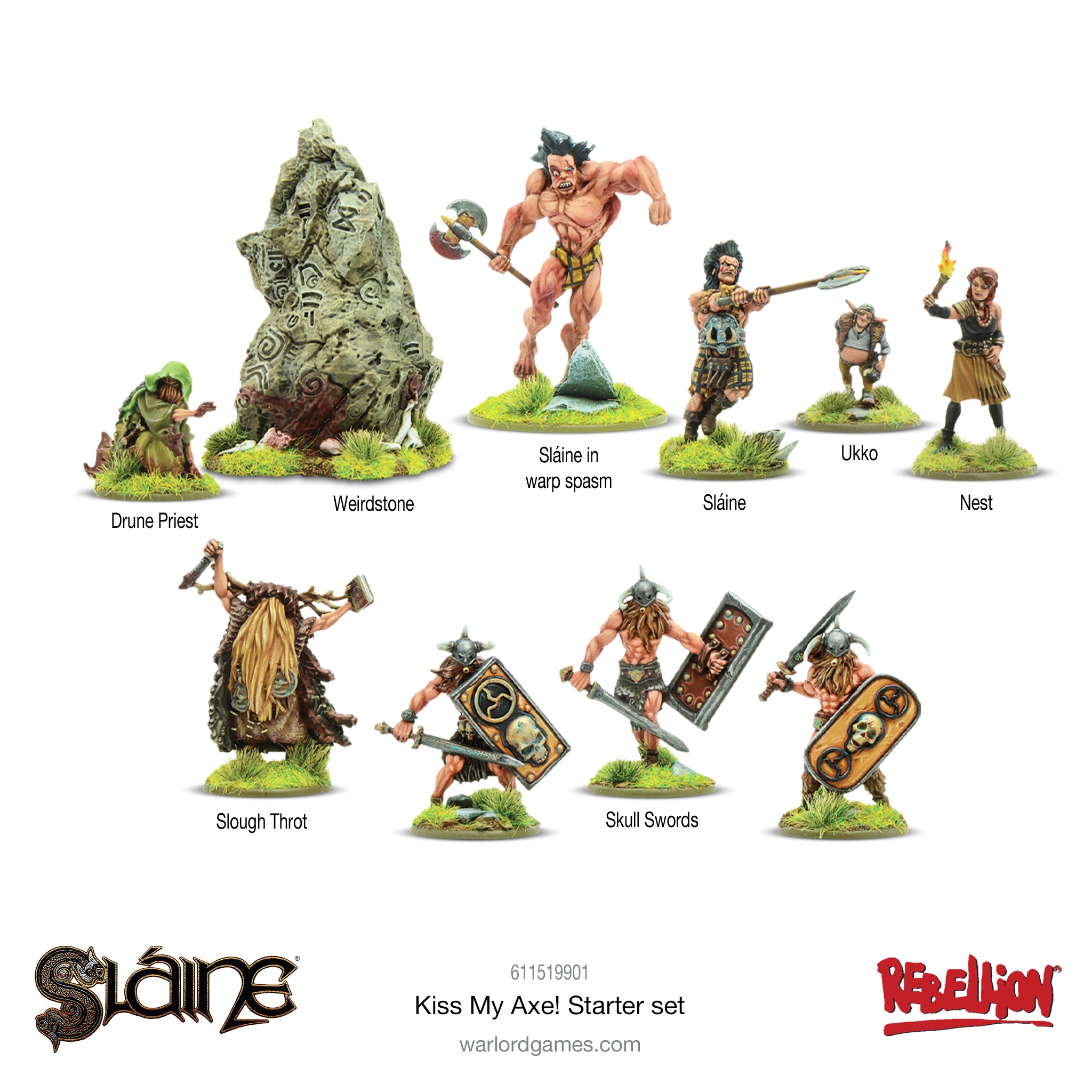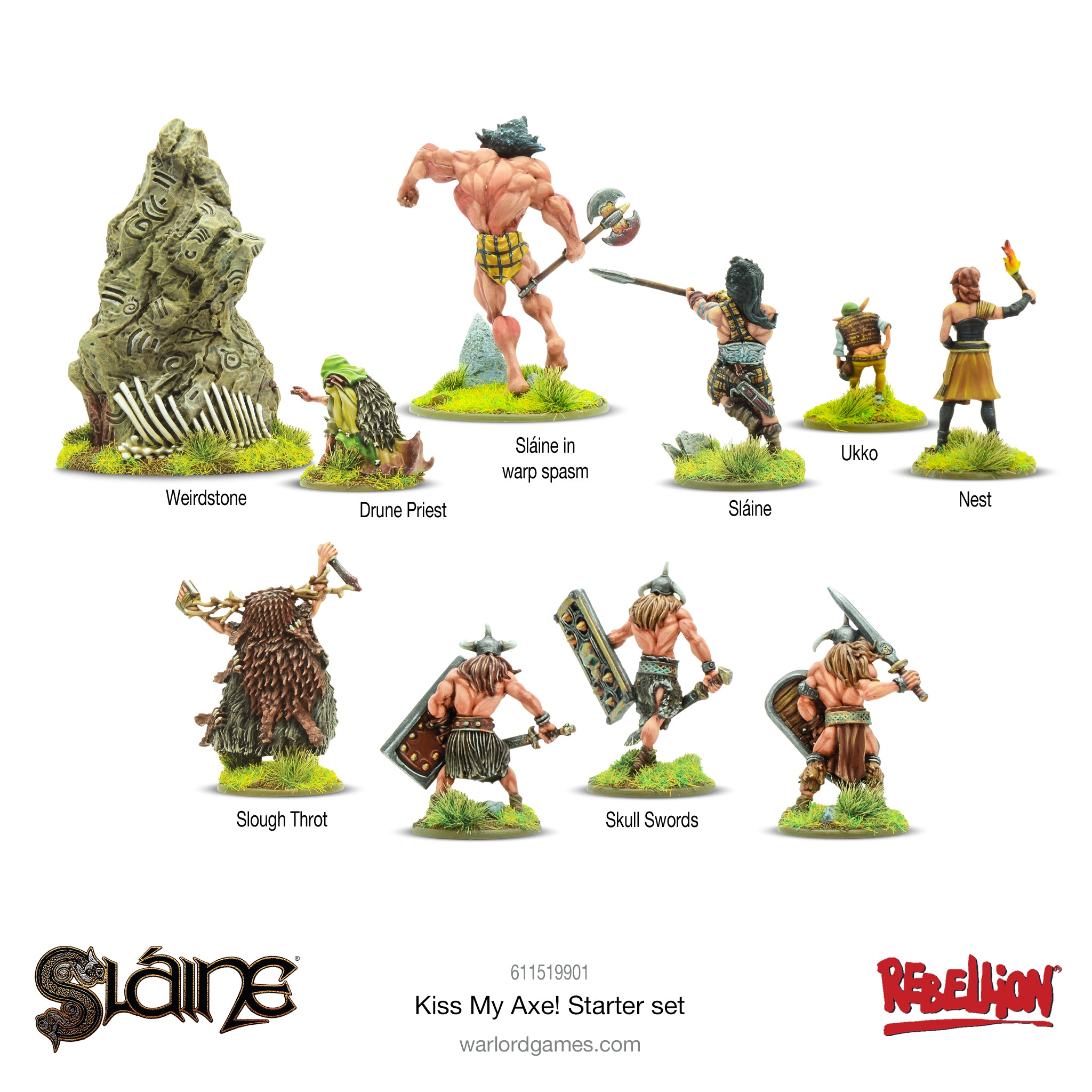 Sláine: Kiss My Axe! is a skirmish tabletop miniatures battle game for two or more players set in the fantasy world created by the legendary comic creators Pat Mills and Angela Kincaid. Axes and swords clash whilst Earth and Sour magic lash out across the Land of the Young, as the Earth Tribes of the goddess Danu battle the decaying Drune Lords and the relentless Fomorian Sea Demons.