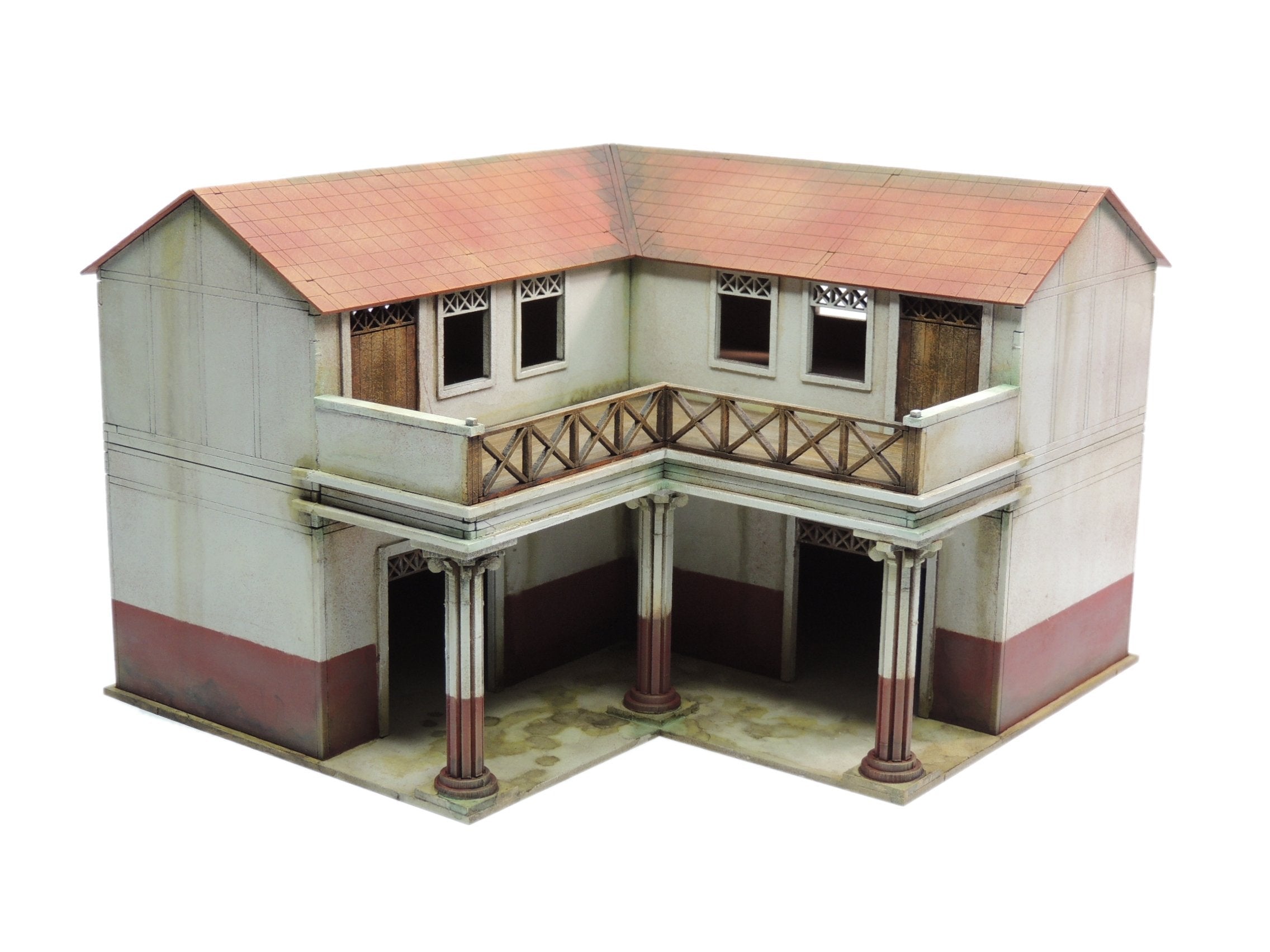 The terrain is made from MDF and is part of the Streets of Rome range. 133mm shortest side x 204mm x to balcony 70mm and roof 140mm